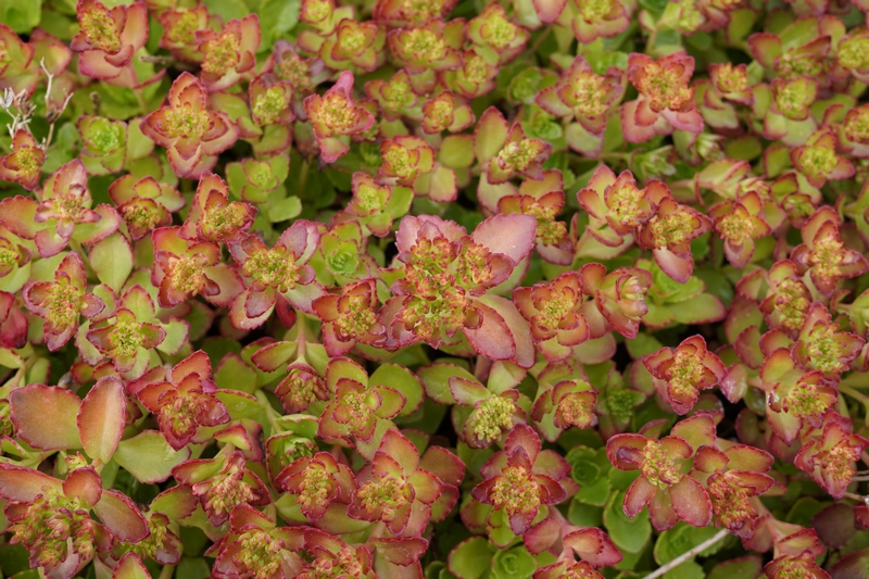 Flache Sedum – Arten und – Sorten sind unkomplizierte und genügsame Bodendecker. Sie eignen sich für den Steingarten oder zur Bepflanzung von Mauerkronen genauso wie für die extensive Dachbegrünung. Sedum kommt mit ausgesprochen wenig Wasser und Nährstoffen zurecht. Auch zur Grabbepflanzung oder als robuster, immergrüner Bodendecker im öffentlichen Grün eignet sich Sedum sehr gut. Die Blüten und das Laub leuchten in kräftigen Farbtönen.